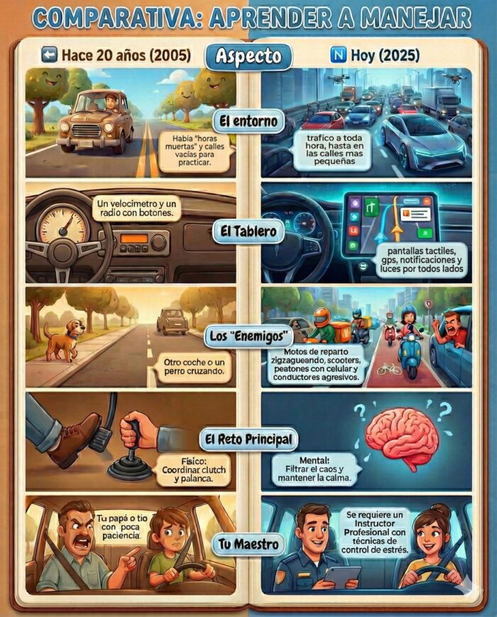 Seguramente sí. Pero aquí está la verdad que nadie te dice: Aprender a manejar hoy es mentalmente mucho más difícil que hace 20 años.